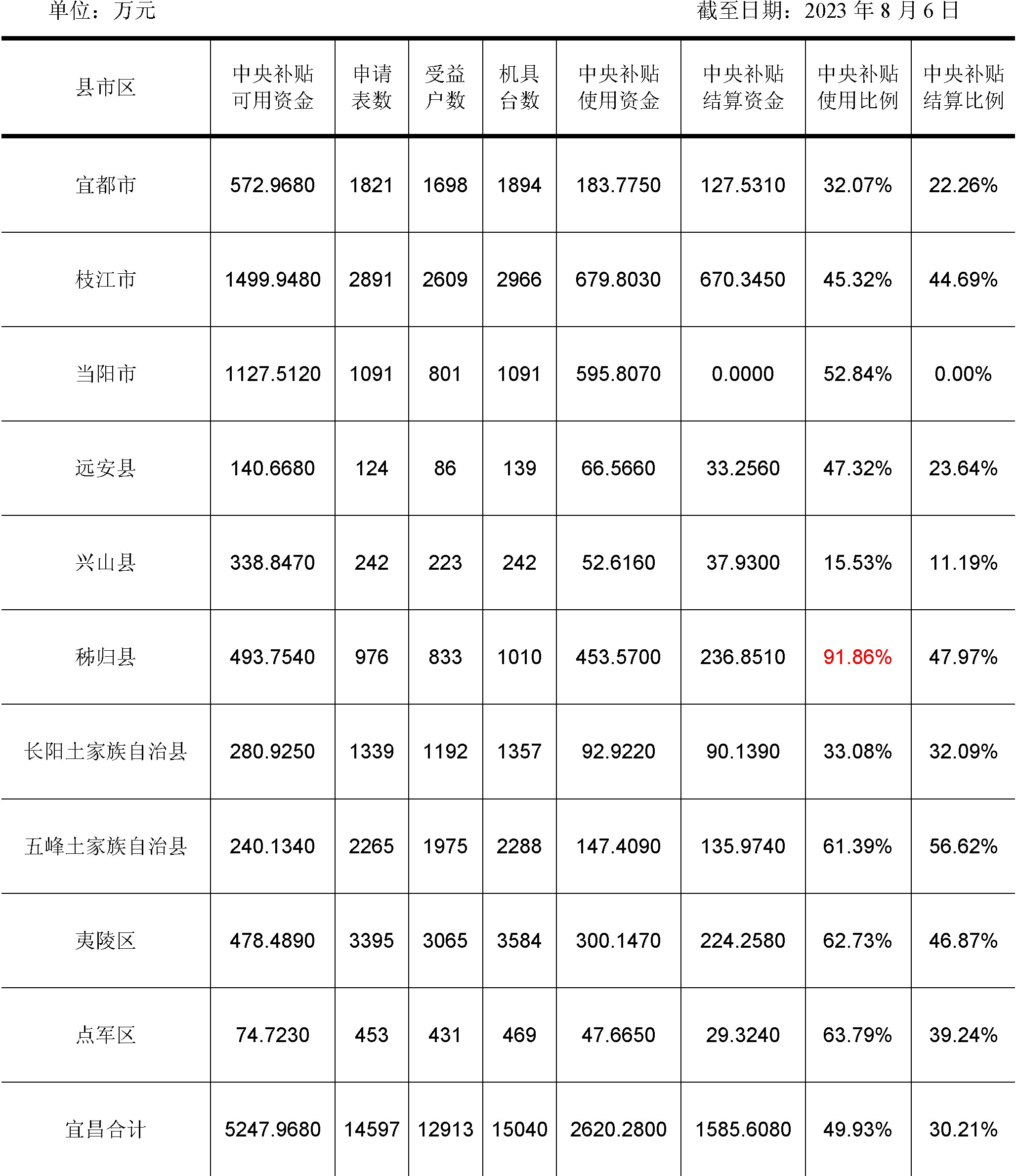 2023年中央下达宜昌市农机购置补贴资金二批6439.7040万元,加上部分县市2022年接转资金144.7040万元,扣减部分县市2022年超录资金1191.7360万元,全市2023年可使用农机购置补贴资金5247.9680万元。截至2023年8月6日,全市先后接受12913个农户(经营主体)提交购机申请14597份,支持购置各类农机15040台套,使用补贴资金2620.2800万元,使用比例占49.93%;其中结算资金1585.6080万元,结算比例30.21%。
