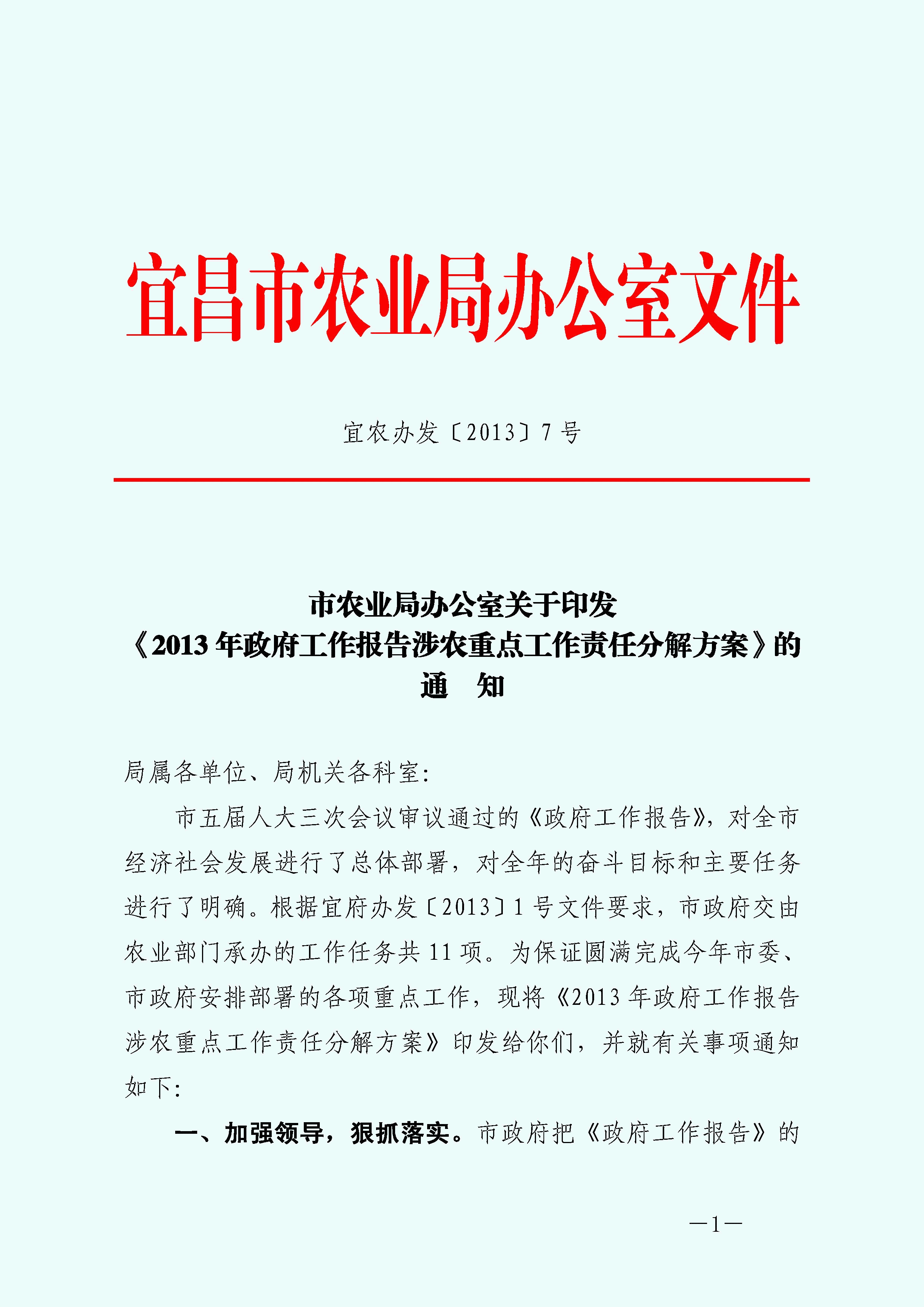 市农业局办公室关于印发《2013年政府工作报告涉农重点工作责任分解方案》的通知