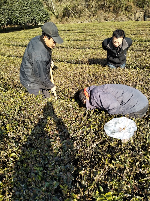 市特产中心技术人员现场查看了茶叶枯萎状况,询问了茶园近期施肥、除草、用药等情况,测试了土壤pH,检查了枯萎茶树根系,最后结合茶园地形和近期天气状况,总结了茶树枯萎落叶的原因,并给茶农提出了改善建议,技术员和茶农表示对处理结果非常满意。