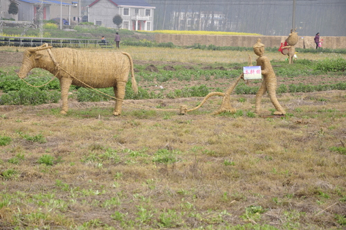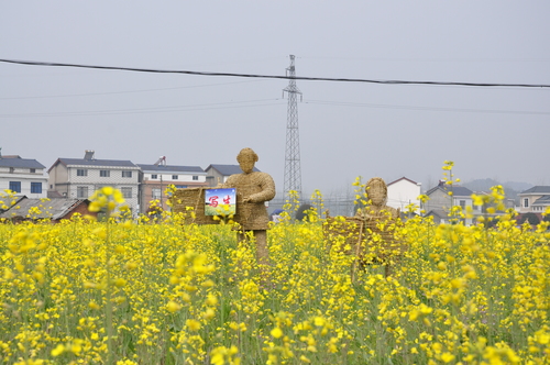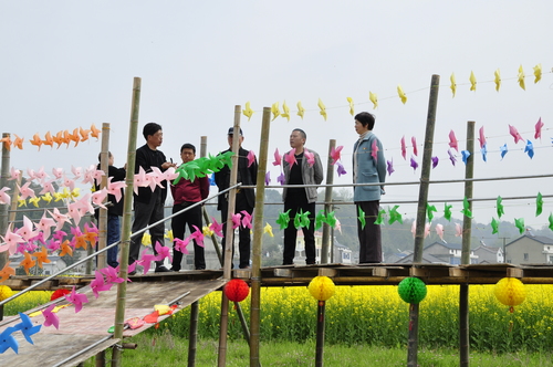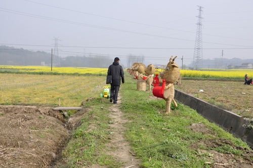 金灿灿的油菜花铺满田园,体现农耕文化的稻草人已“下地干活”,展示生肖文化的“小可爱们”也已伫立田头,乡亲们正忙着布置“大风车”,具说那边的稻草迷宫会更好玩……。一行人首站来到泉水河村油菜花海创建现场。