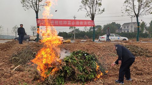 11月6日,市农业农村局在高坝洲镇对350株,总价值约5000元的非法柑桔苗木进行集中销毁。