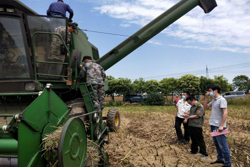 督导组一行在不打招呼的情况下,先到半月镇红光村合旺合作社,对其拥有的拖拉机收割机办理牌照情况、农机操作人员培训、机库的安全消防设施等进行了检查,随后到草埠湖镇,随机对田间作业的联合收割机进行了安全检查。对发现的联合收割机车载灭火器失效、反光标识缺失等问题,开出隐患整改通知单,提出具体整改意见和时间。