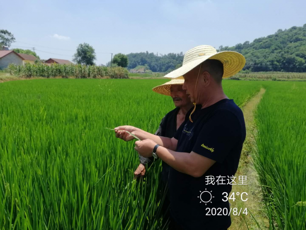 午饭之后,庄光泉与贫困户一道,察看了水稻田间长势长相,对水稻中后期管理提出了建议和技术指导。