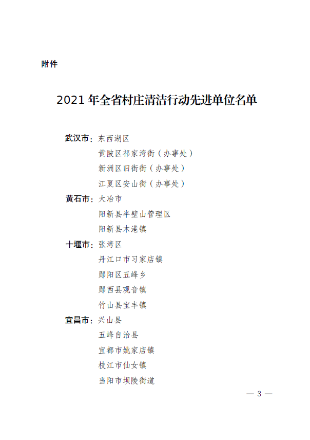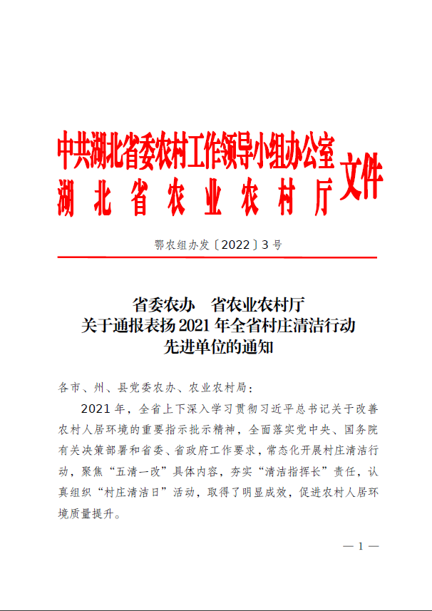(通讯员:王英豪)近日,中共湖北省委农办、湖北省农业农村厅印发的《关于通报表扬2021年全省村庄清洁行动先进单位的通知》(鄂农组办发【2022】3号),对我省67个村庄清洁行动开展有力、效果突出、农民群众满意的单位予以通报表扬,我市姚家店镇光荣上榜。