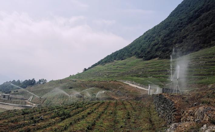 二、喷灌技术确保产业丰收:在县果茶发展中心茶叶专家指导下,九盘山村引水源到茶叶高标准示范基地,利用喷灌技术有效控制喷水量和均匀性,还通过水肥一体化技术有效解决茶园追肥问题。