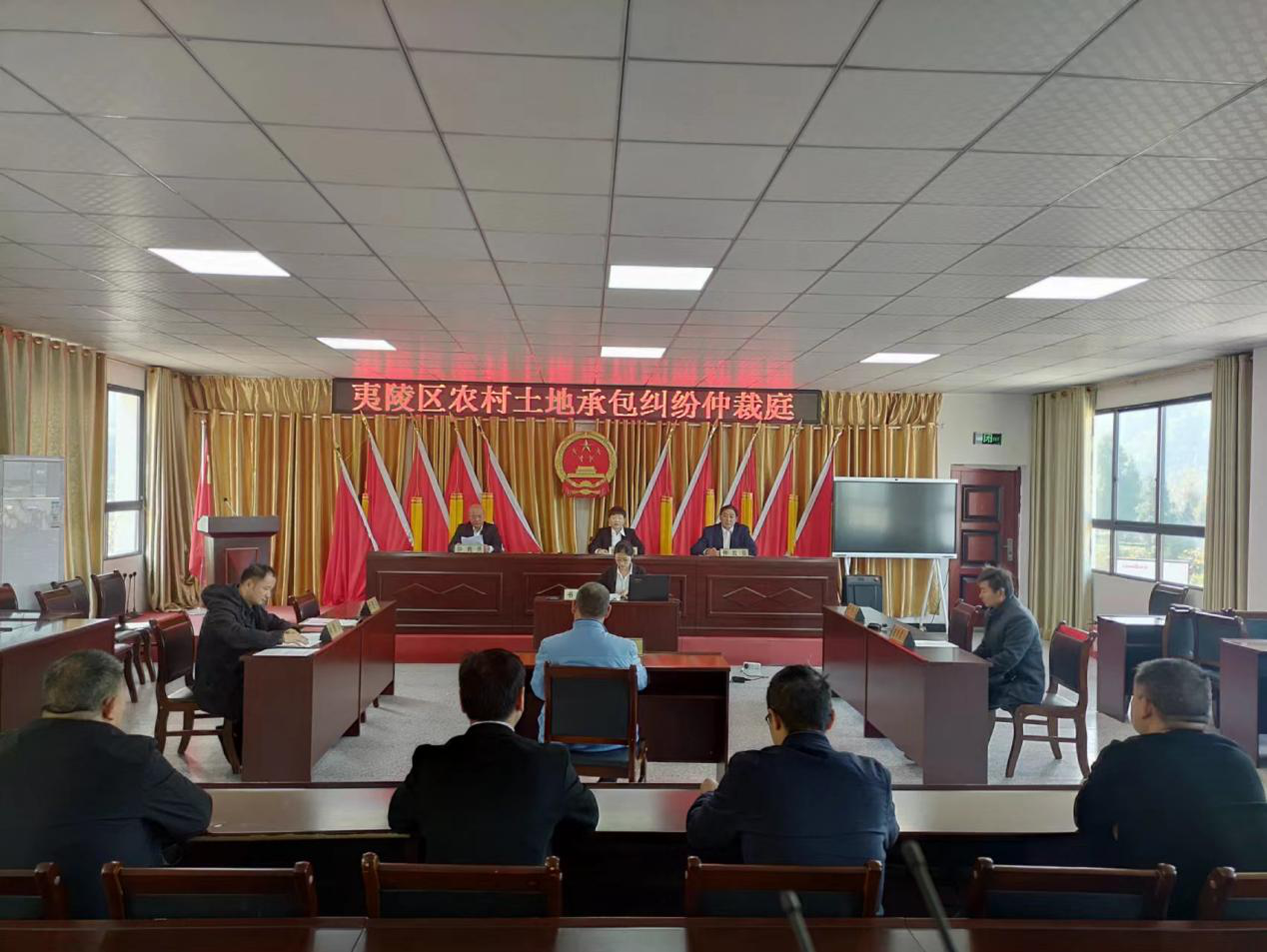 夷陵区农村土地承包仲裁委员会按照《中华人民共和国农村土地承包法》《中华人民共和国农村土地承包经营纠纷调解仲裁法》等相关法律规定受理了此案,并组成仲裁庭。经过前期调查取证,10月12日公开开庭审理此案,双方当事人均到庭参加仲裁,就本案相关内容,按照开庭审理、仲裁庭调查、仲裁庭举证质证、仲裁庭辩论等环节依次进行,并全程公开摄像,我区农村土地承包经营纠纷仲裁委员会依法审结此案,《仲裁裁决书》等相关资料按照相关法律规定随后送达双方当事人。