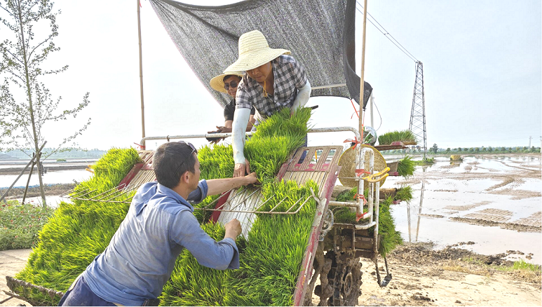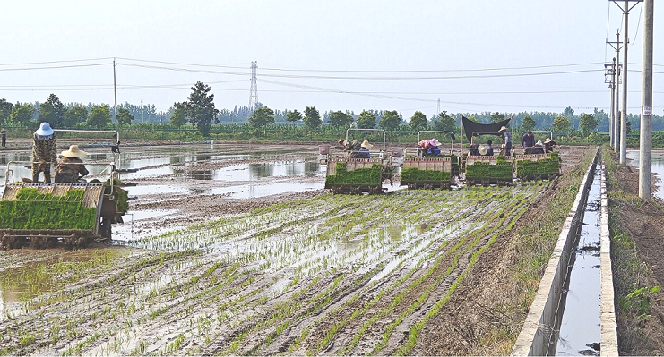 6月14日,在草埠湖镇高标准农田里,盛兴农机专业合作社多台插秧机正在实施跨区农业生产社会化服务,随着机器的轰鸣声,农机手正驾驶着插秧机在田间往返穿梭,所过之处,一盘盘绿油油的秧苗整齐均匀地植入泥土中。
