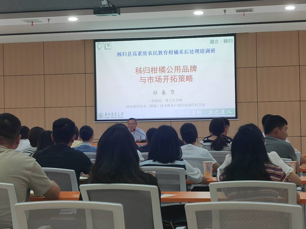 本次跟踪服务特邀国家现代(柑橘)体系经济岗位科学家、华中农业大学二级教授、博士生导师、三峡柑橘产业研究院专家祈春节为参训学员就秭归柑橘公用品牌建设与市场开拓推广做了专题授课,重点从秭归柑橘区域公用品牌建设、柑橘产业联盟的组建、秭归柑橘市场开拓三个方面深入浅出的阐述了柑橘产业发展的现状,具体详实为我们介绍了国内外柑橘产业发展的先进经验,深刻剖析了我县柑橘产业行业发展的新变化、新机制,为秭归脐橙的品质提升、品牌建设、市场营销提出了很好的发展建议。