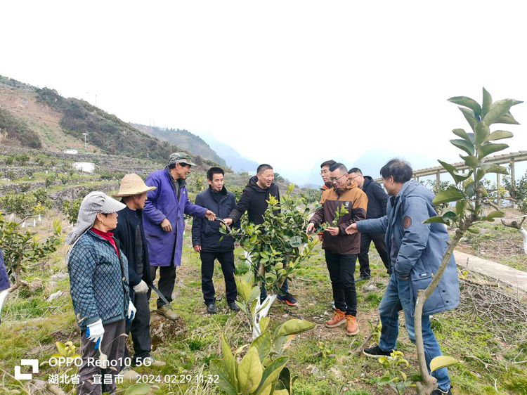 “夏金脐橙”具有果大无核、晚熟高糖、汁多化渣、富有香味等优点,是晚熟柑橘优良品种,2021年通过湖北省林木良种审定,编号:鄂S-SV-CS-003-2021。秭归县果茶发展中心为推广晚熟脐橙优良品种,进一步调整秭归县柑橘品种成熟期结构,2022年对接湖北省农科院果茶所申报了中央财政林业科技推广示范资金三峡库区晚熟脐橙良种‘夏金脐橙’优质栽培关键技术集成与示范项目,该项目获批建设,由湖北省农科院果茶所承担。2月29日,县果茶发展中心请进湖北省农科院果茶所首席科学家蒋迎春、柑橘研究室主任吴黎明一行,到屈原镇指导,就项目选点、项目建设内容、项目协作达成了共识,该项目将在屈原镇建设夏金脐橙核心示范基地100亩,并开展“果园水土保持及沃土、品种更新与高接换种、高光效树形培养与维护、化肥农药减施增效配套栽培”等技术研究集成与示范推广。