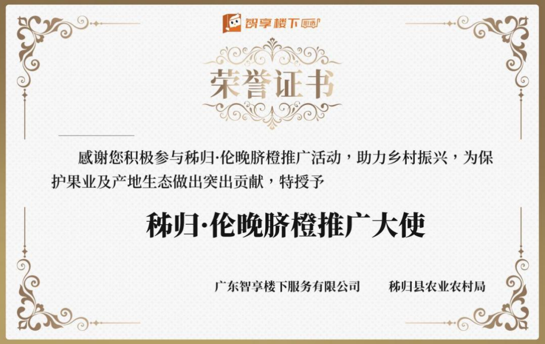 秭归县农业农村局现场对接碧桂园服务集团智享心选全国十二个重点区域核心业主代表,并授予“秭归伦晚脐橙推广大使”证书,每位代表都变成了秭归伦晚脐橙的公益推荐官。