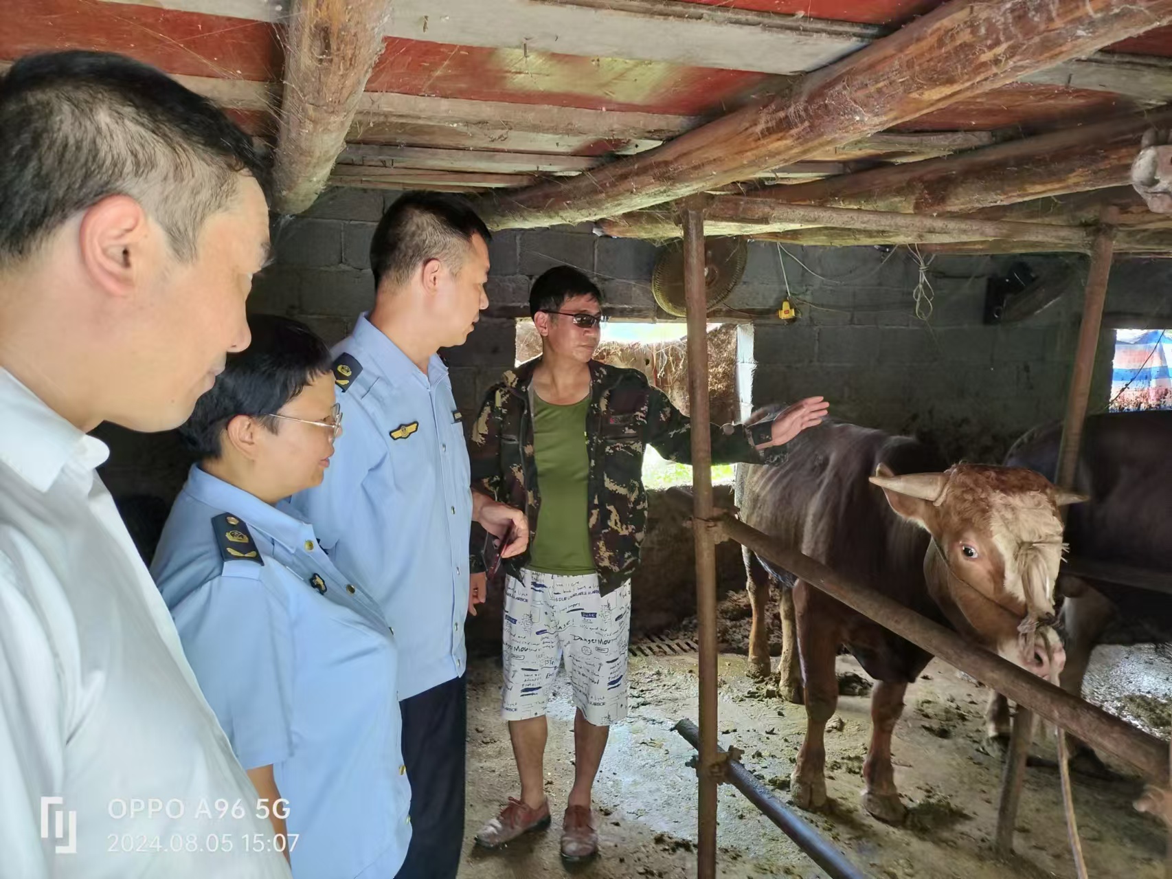 8月5日,兴山县农业综合执法大队和峡口镇畜牧兽医服务中心工作人员一起来到老朱的农场,对引进的3头肉牛进行了现场检查。经检查,该批肉牛检测报告、检疫证明等资料齐全,已执行隔离观察和消毒等措施。“老朱,你刚买回来的3头牛一定要隔离观察30天,有异常情况随时向镇畜牧兽医服务中心报告,等隔离期结束了而且经我们现场确认正常后,才能混群饲养。”工作人员就隔离期相关事项进行了再三叮嘱。
