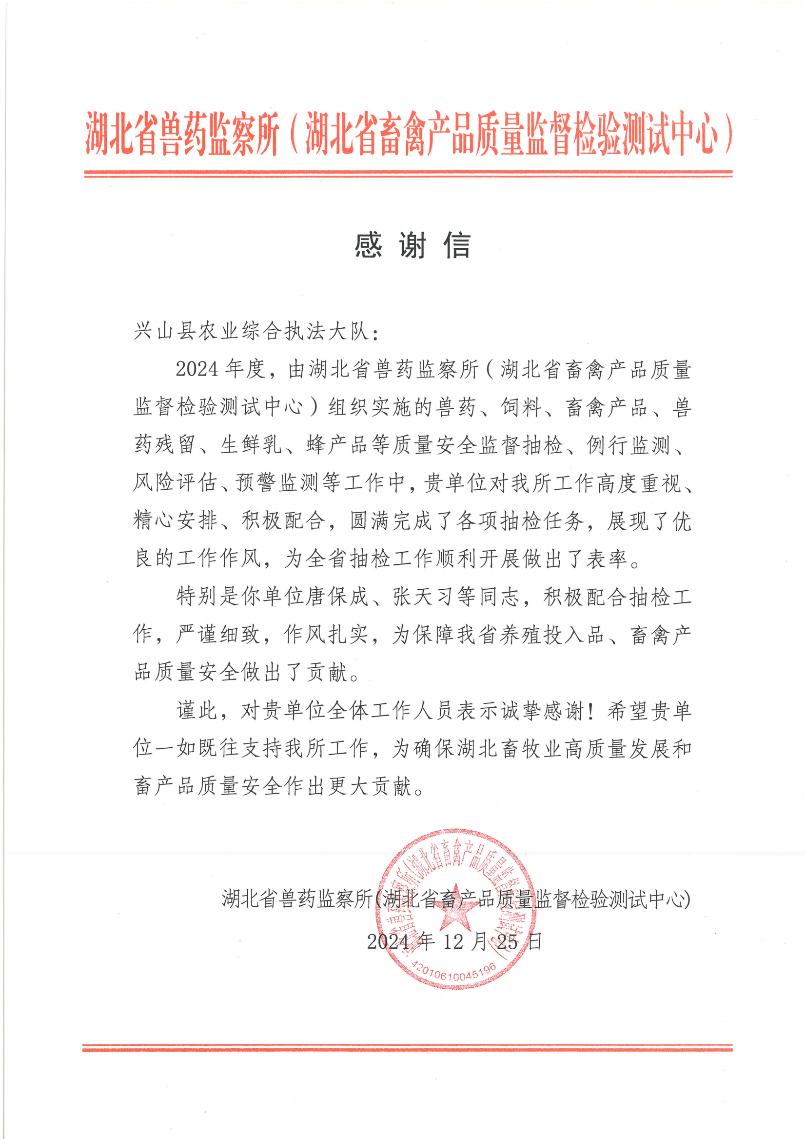 近日,湖北省兽药监察所(湖北省畜禽产品质量监督检验测试中心)向我县农业综合执法大队致感谢信,对我县畜禽产品质量安全抽样检查工作给予充分肯定。