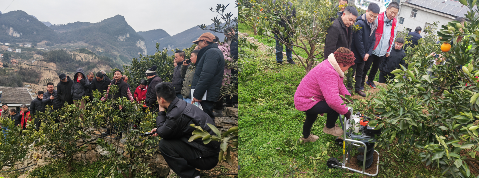 现场还特邀了秭丰农业科技发展有限公司王开华为大家带来了新型农机具-果园打孔机,现场为柑农亲手示范讲解打孔机如何高效作业、改善土壤透气性、深施有机肥,为柑橘根系生长创造良好环境。柑农们跃跃欲试,纷纷上前体验,伴随着打孔机“轰隆隆、轰隆隆”的作业声,桂垭村的春培春管工作也被推向了高潮。