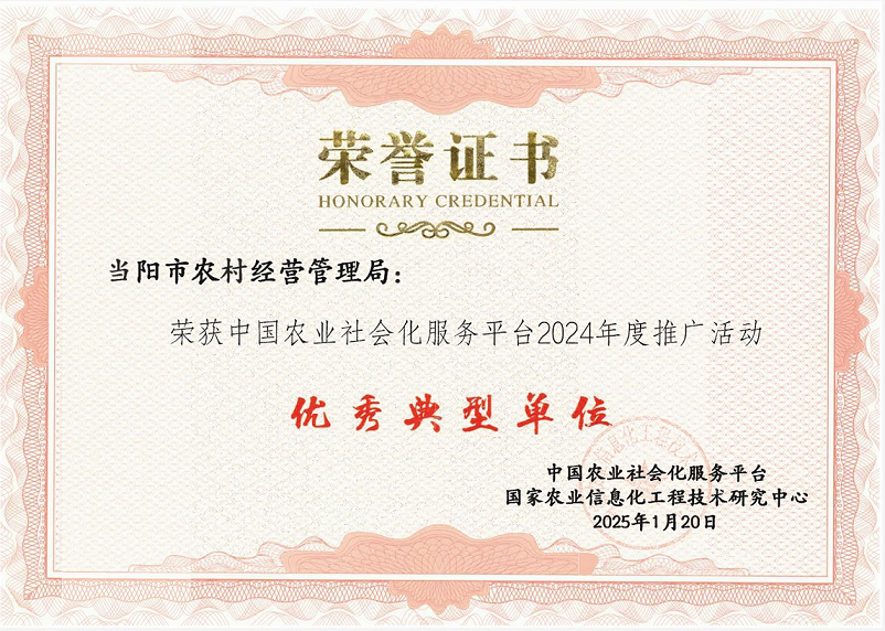 近日,当阳市农村经营管理局获评中国农业社会化服务平台“2024年度推广活动优秀典型单位”,标志着我市农业社会化服务平台推广工作迈入全国先进行列。