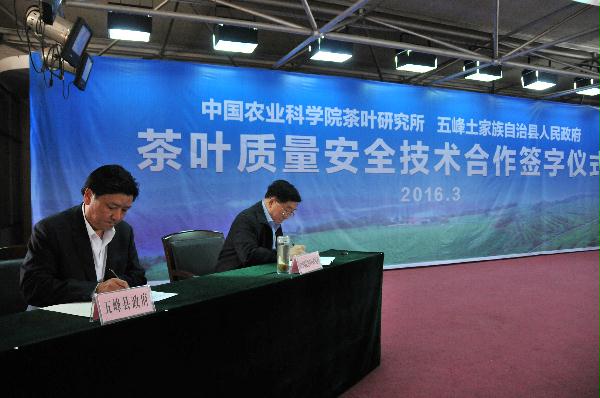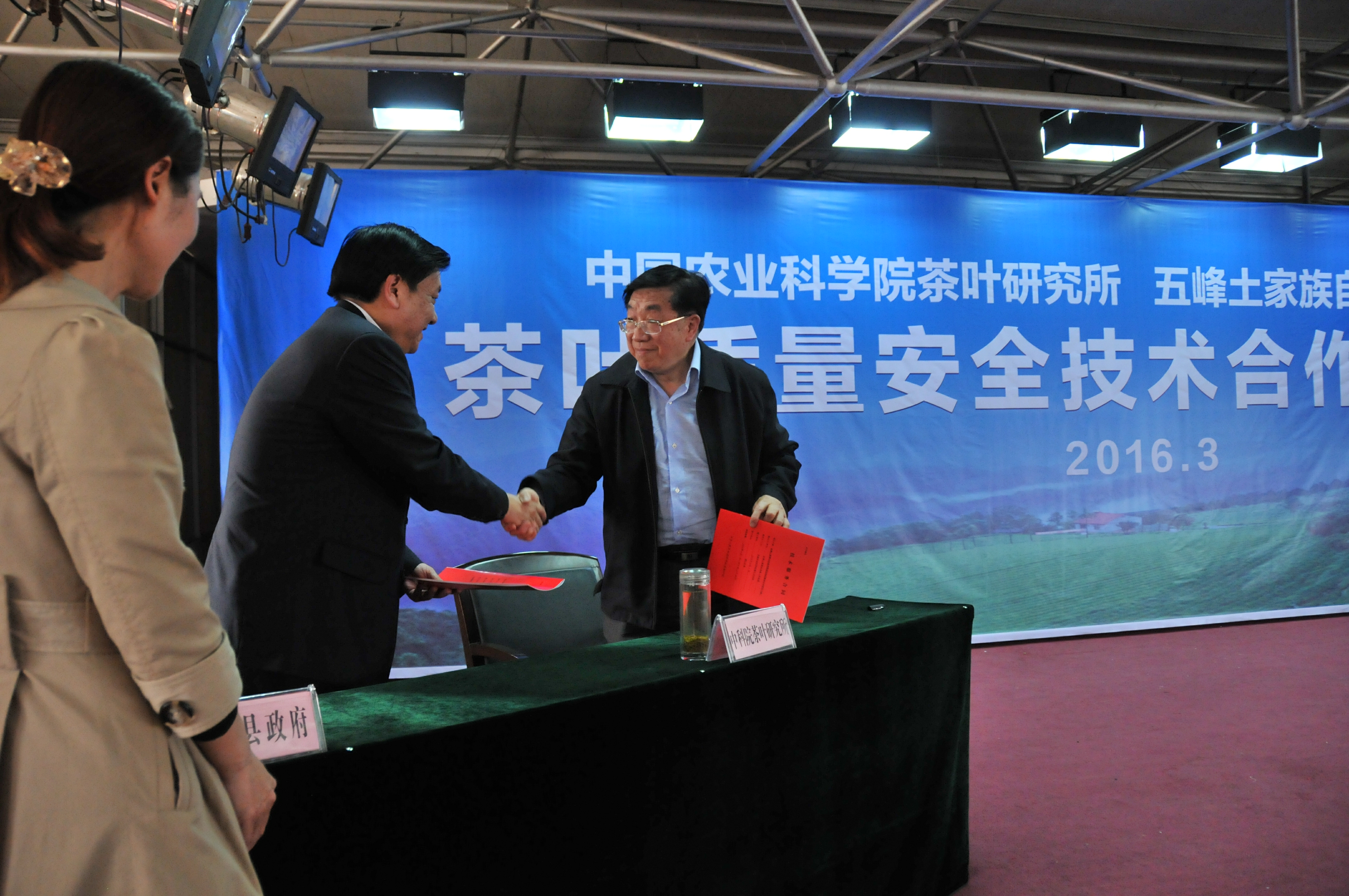 中国农业科学院茶叶研究所与五峰自治县人民政府就推广普及茶园病虫害绿色防控集成技术达成合作意向,于2016年4月1日,在五峰后河宾馆举行《茶叶质量安全技术合作》签字仪式,国家食品安全风险评估专家委员会副主任委员、中国工程院院士、中茶所研究员陈宗懋与五峰自治县人民政府县长万红代表双方在协议书上签了字。签约仪式由自治县委书记陈华主持,县委常委宋永鸿、陈延斌、王巍及县委、县政府、县人大、县政协领导参加了签约仪式。