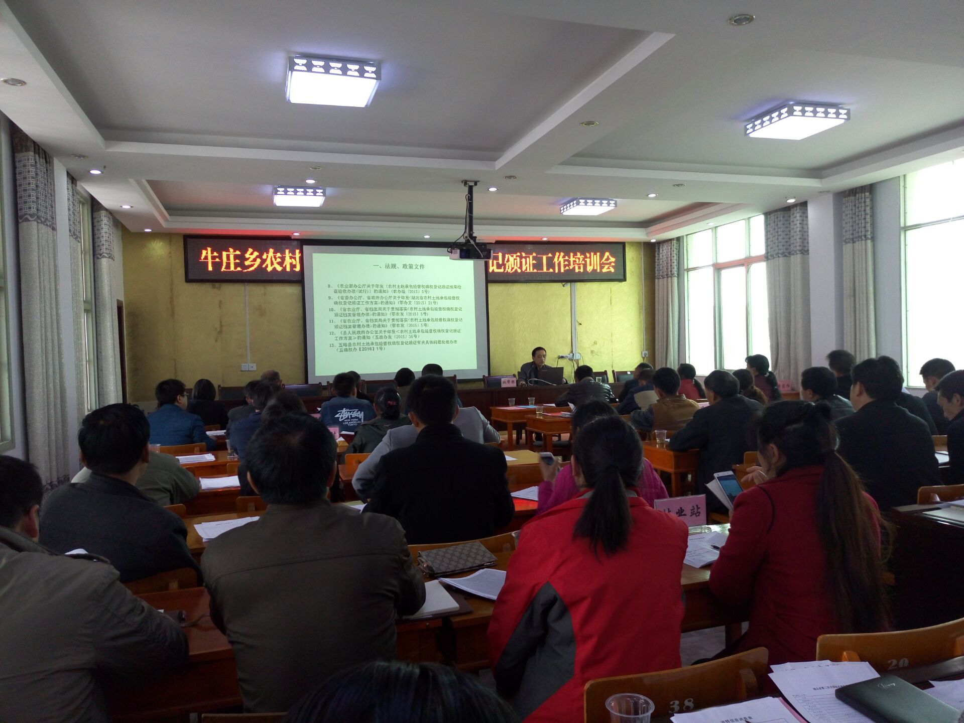 本网讯(通讯员:杨正容)继4月5日五峰土家族自治县农村土地承包经营权确权登记颁证工作推进会结束后,为加快全县土地确权工作进度,4月11日开始,县经管局从牛庄乡开始,深入到八个乡镇开展农村土地确权登记颁证工作业务培训会,预计在2周的时间完成八个乡镇的培训任务。乡镇领导、驻村工作队员、工作专班干部及各村村委会干部、经办人员参加了培训。