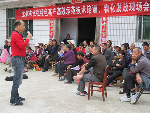 4月19日,宜都农技中心技术人员专程来到枝城镇泉水河村,现场为100余村民进行水稻绿色高产高效种植技术培训。