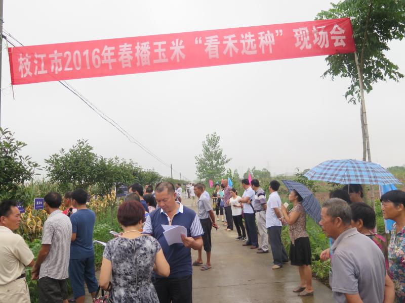 2016年8月5日,枝江市2016年春播玉米“看禾选种”现场会在枝江市七星台镇董家湾村召开。宜昌市农业技术推广中心主任朱德平,枝江市农业局相关领导、各镇农业服务中心主任及农民代表,种子经销商共50多人参加了现场会。