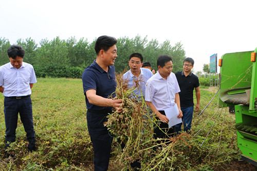 许志华(左一)观察花生机械收获情况