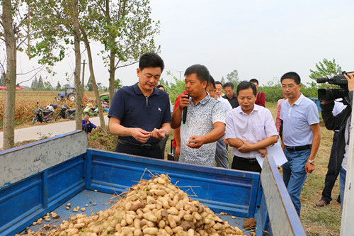 许志华(左一)察看新收获的花生