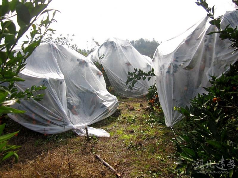 远安柑橘品种以中熟大叶尾张、椪柑为主,面积占全县柑橘总面积的70%以上,成熟期集中在11—12月份,加上柑橘经销商大多推崇带枝叶销售,从而影响了柑橘采收进度,部分柑橘果实还挂在树上等待现采现卖。若遇短时间的零下极端低温就会给柑橘果实带来严重影响,对树体也会造成损伤,为避免对柑橘生产带来不良后果,目前广大橘农在县农业局的指导下积极开展自救,树冠覆膜是柑橘防寒抗冻行之有效的措施之一。