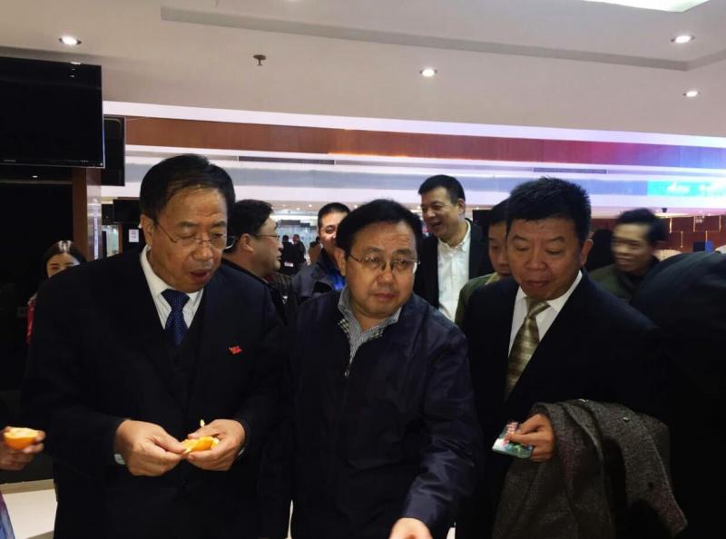 宜昌市委常委、副市长王国斌(中)、枝江市副市长李奎阳(右一)等品尝并推介宜昌蜜桔