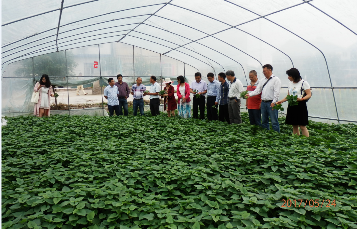 顾家店镇人和垸村,专家们走进大棚,考察了枝江市人和蔬菜种植专业合作社种植的菜用薯--鄂菜薯1号生产情况。该合作社用大棚加小拱棚进行菜薯越冬,今年春季大棚扩繁到27个,目前棚内菜薯长势喜人。