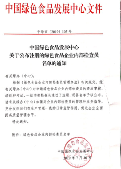 绿色食品企业内检员为企业申报绿色食品创造了条件,我们将对申报绿色食品的企业给予帮助和支持,让绿色食品发展进入快车道。