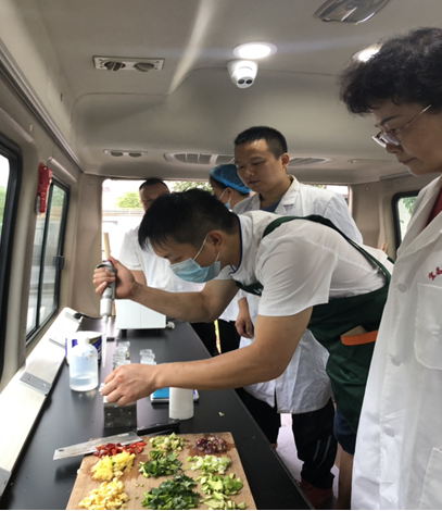 当天在种植基地抽取了辣椒、苦瓜、苕叶、空心菜等11个应季蔬菜和西瓜、葡萄2个水果样品后。在流动检测车上站科技人员和基地检查人员一起对样品进行了检测,并现场为企业出具了快检检测报告,并将样品带回做进一步的详检。同时科技人员胡浒、张雅静又用相同的样品在企业快检室做了快检比对,同企业检验人员就检测技术进行了培训交流。