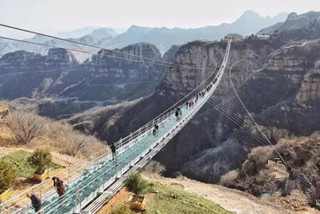 昨日,世界最长悬跨式玻璃索桥吊桥开放。吊桥位于河北平山红崖谷景区内,长488米,桥面离地面最大高差218米,相当于66层楼高。(东方网)