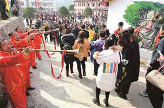2017年12月30日,秭归县杨林桥镇在响水洞村举办生态年猪宴暨堂鼓文化节。来自武汉、宜昌等地的1000多名游客现场观看杨林堂鼓表演、品尝地道乡村年猪宴等,把大山村搅得热热闹闹。(记者何宝喜)