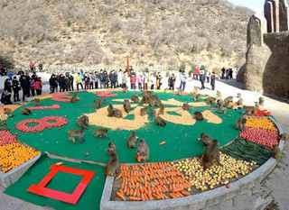 2017年12月31日,中国猴山--河南济源五龙口太行山猕猴自然保护区,为太行山的野生猕猴举行了一场别开生面的跨年派对。现场直径12米的超级“餐桌”上的“福”字和“2018”夺人眼球,它们都是由猴子喜爱的“果蔬杂粮”拼成。猕猴们蜂拥而至,不亦乐乎。(中新网)