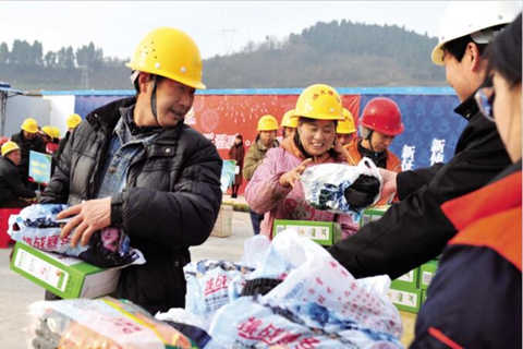 昨日,宜昌市建筑业协会“寒冬送温暖 祝福进工地”活动走进夷陵区城大建设项目工地,为坚守在施工现场的100多名农民工熬制姜汤驱寒,书写春联,发放手套、鞋子、口罩、暖宝宝、奶茶等爱心物资。(记者张国荣)