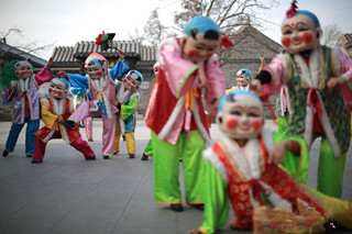 昨日,天津杨柳青镇,年画舞队在表演中,传统的大头娃娃“走”下了年画,舞出民俗之美。当天,第十五届西青区民俗文化旅游节正式拉开帷幕。(中新社)