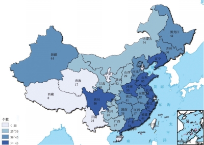 图4是营业收入为100亿元以上的农业产业化龙头企业的分布情况,从中可以看出,东部沿海地区有31个龙头企业的营业收入高于100亿元,占比63%;中部地区有13个营业收入高于100亿元,占比27%;西部地区有5个营业收入高于100亿元的龙头企业,占比10%。结合表1和图4可知,尽管东部沿海地区的龙头企业数量不及中部地区,但是营业收入高于100亿元的龙头企业数量远远大于中部和西部地区。这也进一步的反映了我国中部地区的农业产业化龙头企业数量多,但规模相对较小的现象。与之相反,东部地区的农业产业化龙头企业数量少于中部,但规模体量较大。西部地区无论从数量或者体量上都与东部和中部地区有差距。