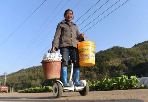 12日,福建南平富头村55岁的龚荣娘踏上她的电动平衡车去巡视她的“蔬菜王国”去了。两年前,龚荣娘在网上“秒杀”到了一部价值近2000元的电动平衡车,她仅花了三个多小时就学会了这个新奇的“玩意儿”。(中新网)