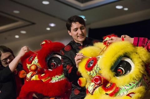 当地时间2月15日,加拿大总理特鲁多身穿唐装,与当地华人一起庆祝中国农历新年,为舞狮点睛。(新浪)