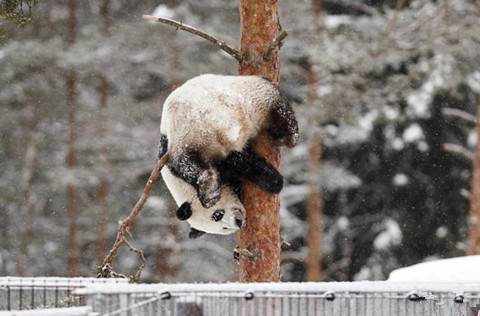 当地时间2018年2月17日,芬兰艾赫泰里动物园自然保护区对外开放,雌性大熊猫卢米在雪中玩耍,上演倒挂金钩,异国过新年。(中新网)