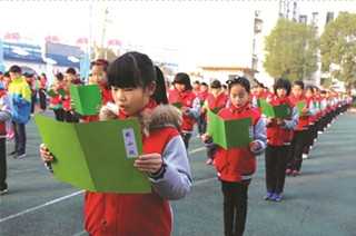 昨日,宜昌30万中小学生迎来2018年春季学期。今年的新春第一课,首次引入环保话题,以“践行生态文明,守护美丽宜昌”为主题展开。图为镇镜山小学少年在开学典礼上齐诵《镇小赋》。