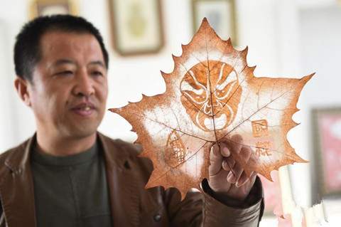 2日,山西省襄垣县小堡底村,民间艺人郝旭东展示其制作的脸谱叶雕作品。一幅叶雕作品需要经过树叶采集、防腐加工、叶肉剥离和制模雕刻四个步骤,至少需3天时间才能完成。郝旭东几年来制作叶雕作品数百件。(中新网)
