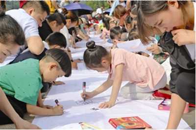昨日,长阳城区长阳广场,206名幼儿与400多名家长集体创作百米环保画卷,让环保意识深入孩子们心中。(通讯员刘洪进)