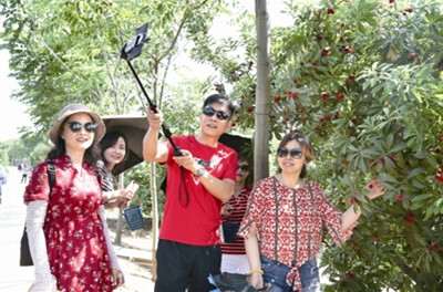 10日,枝江问安杨梅采摘欢乐游盛大开园。此次节会包括杨梅采摘、杨梅美食品鉴、石榴花赏鉴、荷花品鉴、摄影师拍照、园内寻宝等系列活动。图为游客在杨梅园游玩。(通讯员尹雅)