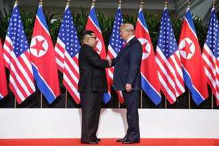 当地时间12日上午,朝鲜最高领导人金正恩与美国总统特朗普在新加坡嘉佩乐酒店举行首次会晤,双方握手致意。这是在任的朝美领导人数十年来首次会晤及握手。(中新网)