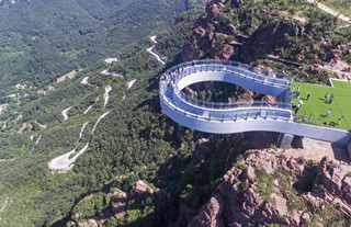 昨日,河南省新密市伏羲山旅游区的悬空玻璃环廊正式落成,将于16日起对外开放,该桥采用无斜拉索设计,桥面使用150块三层钢化夹胶玻璃铺设,距离峡谷地面360米,环廊伸出悬崖30米。(中新网)