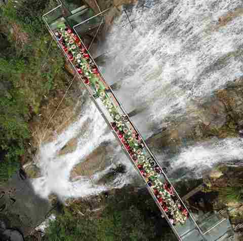 昨日,众多瑶族人在湖南九龙江的水幕高空玻璃栈道上摆起了全粽长龙宴,瑶族人用粽叶包裹着酒菜与前来的游人分享,以此方式迎接即将到来的端午佳节。(中新网)