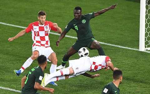 今日凌晨,世界杯D组比赛,克罗地亚对战尼日利亚。上半场比赛,曼朱基奇禁区内头球攻门,碰在尼日利亚球员艾特博身上飞入球门(图)。下半场比赛,莫德里奇点球得分,克罗地亚2-0完胜尼日利亚。(网易)