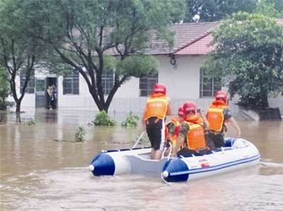昨日,入梅首场强降水袭击宜昌,市气象局连发八道气象预警。本次降水过程中,当阳等地灾情较重,发生农田被淹,紧急转移被困群众等情况。图为当阳子龙村二组一民房被淹,屋内一家四口被困。清晨5时30分,消防员撑橡皮艇,半小时将人救出。(记者王晶晶)