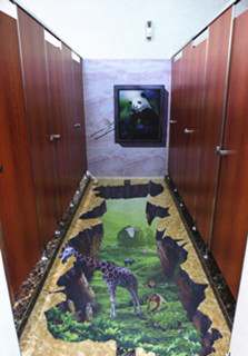昨日,重庆沙坪坝现3D公厕,市民入厕犹如森林探险。该公厕在地面、墙面上布置了11张3D画,有森林、动物、高山、瀑布,为入厕市民营造出穿越的感觉。(中新网)