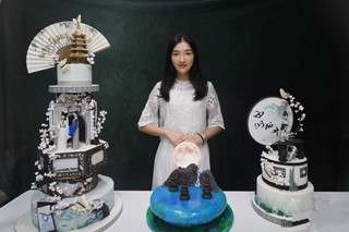 昨日,蛋糕师陈瑶正在展示翻糖蛋糕。陈瑶是在浙江杭州的一名翻糖蛋糕师,她与同伴汪慧将白娘子、雷峰塔等杭州文化符号雕刻在翻糖蛋糕上,演绎独特的“江南记忆”。(中新社)