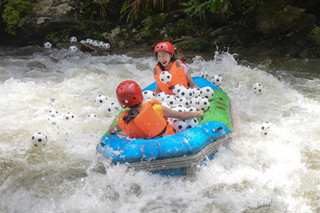 昨日,湖南平江连云山举行“足球漂”活动,身着球迷服的足球宝贝与市民乘船漂流在布满足球的河道上,以此躲避高温。(中新网)